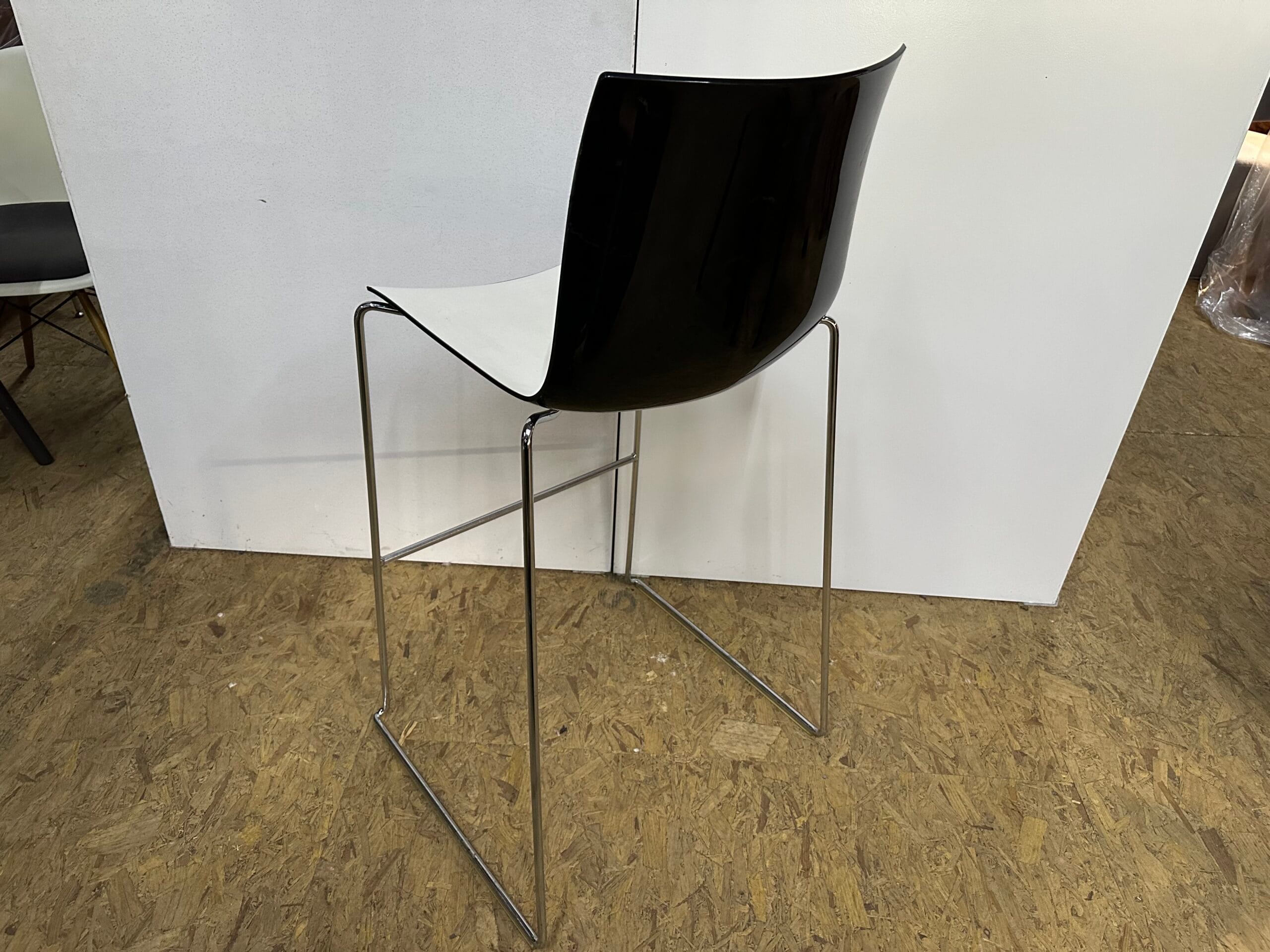 White on black bar stool with chrome frame from Arper. Stackable.