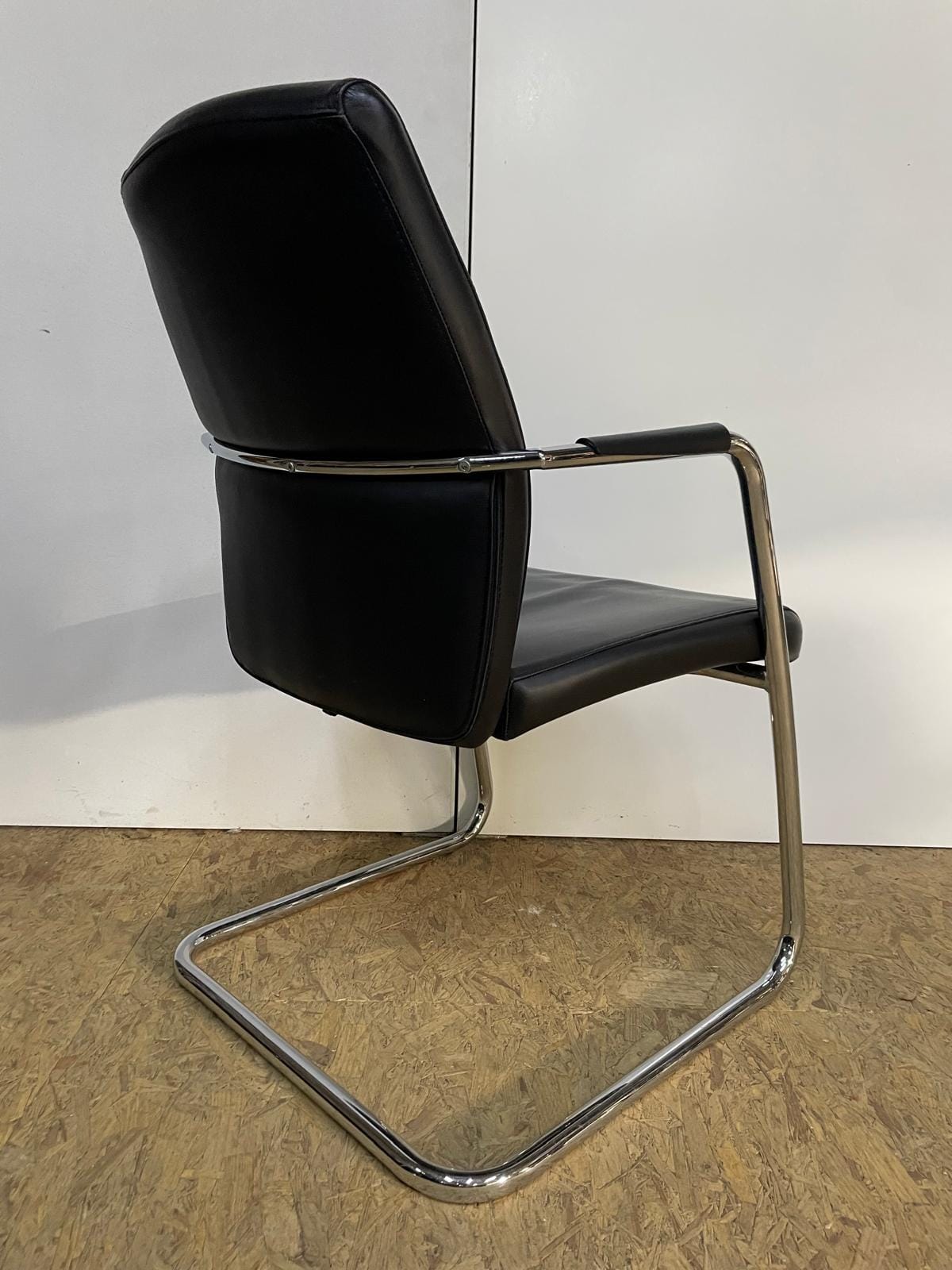 Black leather cantilever meeting chair with chrome base.