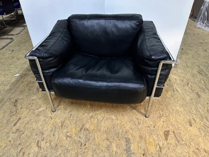 Black leather arm chair with chrome frame.