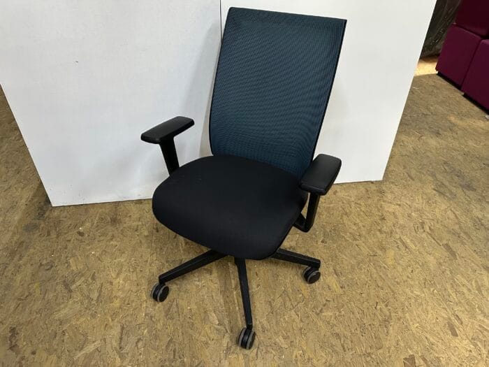 Adjustable operators chair with blue mesh back, black fabric seat and arm rests. Back tilt and seat slide function.