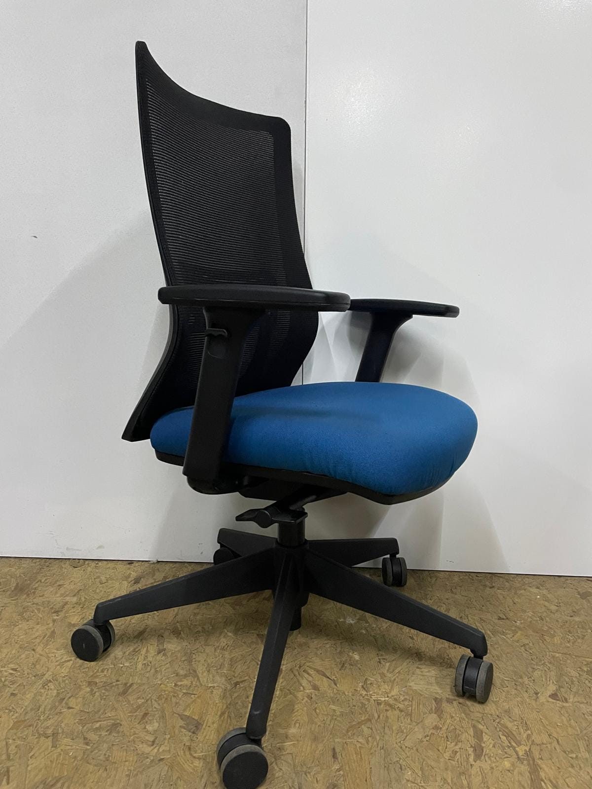 Okamura operators chair with blue fabric seat and mesh back. Fully adjustable.