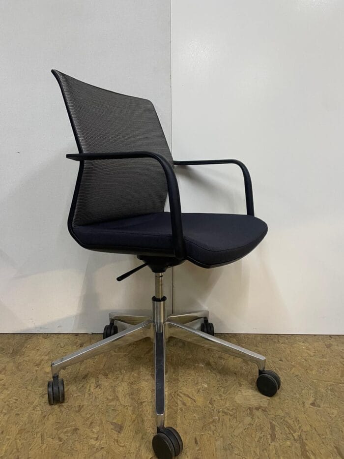 Orangebox meeting chair on castors with height adjustment. Grey fabric seat and light grey mesh back. With arms.